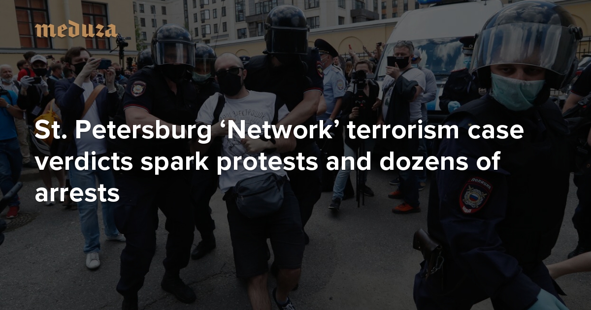 On June 22, a military court in St. Petersburg sentenced two suspects in the high-profile “Network” (“Set”) terrorism case to a combined total of 12.5 years in prison, for their roles in organizing an alleged terrorist group among left-wing activists in Penza and St. Petersburg. Twenty-five-year-old computer programmer Viktor Filinkov was sentenced to seven years in prison, while 28-year-old alpinist Yulii Boyarshinov — who was also convicted of illegal possession of explosives — was sentenced to five and a half years. After the verdicts were announced, law enforcement began arresting activists protesting in support of the accused outside the courtroom en masse. Meduza recounts how the verdicts in the “Network” case sparked the first group protest in St. Petersburg since the start of the coronavirus pandemic.