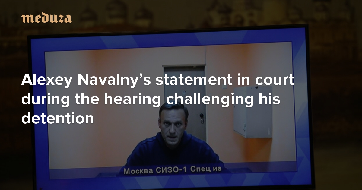 On January 28, the Moscow Regional Court rejected an appeal from opposition figure Alexey Navalny and his lawyers, who were seeking his release from pre-trial detention. Navalny will remain at Moscow’s Matrosskaya Tishina remand prison, where he was placed in custody after returning to Russia from Germany on January 17. During the hearing, Navalny addressed the court via a video link from the prison. Here’s Meduza’s translation of Navalny’s speech.