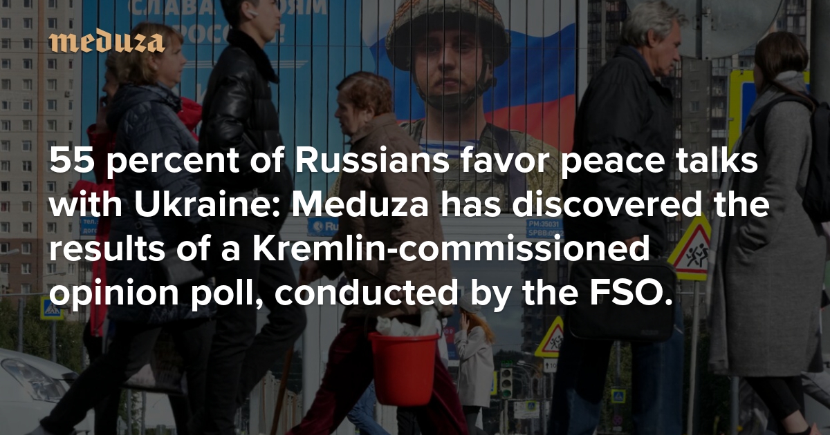 Russia’s ongoing military defeats in Ukraine and the social burden of mobilization are rapidly cooling the public’s support for the war. Meduza has gained access to the results of an opinion poll commissioned by the Kremlin “for internal use only.” According to the study conducted by the Federal Protective Service (FSO), 55 percent of Russians favor peace talks with Ukraine, while only a quarter of the respondents still support continuing the war.