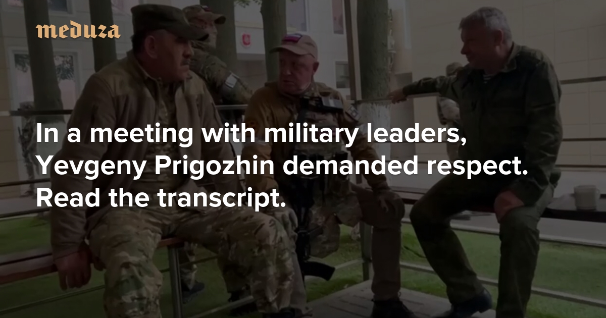 On Saturday morning, a video appeared on Telegram that appears to show “negotiations” between Yevgeny Prigozhin, Deputy Defense Minister Yunus-Bek Yevkurov, and Deputy Chief of Staff Vladimir Alexeyev at the Southern Military District’s headquarters in Rostov-on-Don. The previous evening, Prigozhin accused the Russian Defense Ministry of carrying out a missile attack on a Wagner Group camp and announced his units were setting out on a “march of justice” against Russia’s military leadership. Overnight, Wagner fighters cordoned off multiple military and administrative buildings in Rostov-on-Don. Meduza is publishing a transcript of the conversation between Prigozhin, Yevkurov, and Alexeyev heard in the video.