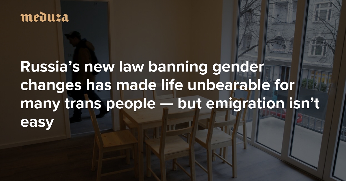 In July, the Russian government passed legislation banning gender transition (or “sex changes,“ as it appears in the law). Now, it’s illegal for transgender people in Russia to change the gender marker on their official documents, legally purchase necessary (and, during certain stages of transition, lifesaving) medications, or adopt children and be their legal guardians. Furthermore, the government can now annul the marriages of people who have changed their gender marker — even if they changed it before the law passed. With all of these new restrictions in place, it’s no surprise that many trans Russians are trying to get out of the country. To learn how this new reality has affected them, Meduza spoke with two trans people who left Russia and one who’s currently planning his escape.