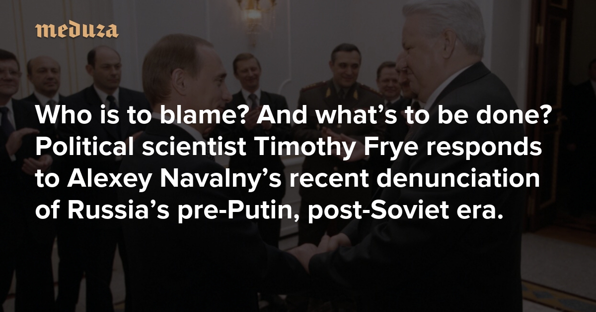 Earlier this month, the imprisoned Russian politician Alexey Navalny released, with the help of his team, an extended essay on who should be held responsible for the erosion of democracy in Russia. Navalny’s insistence that Russia’s authoritarian turn under Putin is rooted in the unprincipled politics of the 1990s sparked a discussion about how much that period still matters in determining the outlook of contemporary Russia. Timothy Frye, the author of “A Weak Strongman: The Limits of Power in Putin’s Russia,” discussed this question with Meduza special correspondent Margarita Liutova. Meduza presents a condensed English-language version of Timothy Frye’s side of that conversation, edited lightly for clarity.