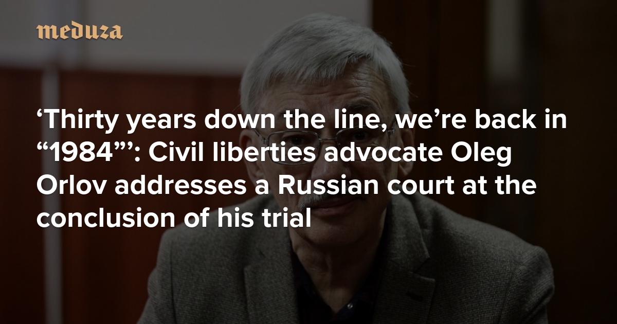 ‘Thirty years down the line, we’re back in “1984”’ Civil liberties advocate Oleg Orlov addresses a Russian court at the conclusion of his trial
