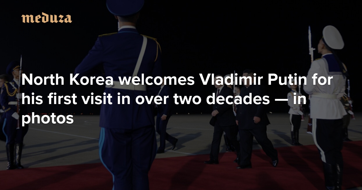 Russian President Vladimir Putin received a lavish reception as he arrived in North Korea early Wednesday morning, marking his first visit to the country in 24 years. North Korean leader Kim Jong Un personally greeted him on the tarmac at Pyongyang’s airport, and the capital was adorned with Russian flags and pictures of Putin. During the two-day state visit, Moscow and Pyongyang are set to sign several key agreements, including a comprehensive partnership deal. Meduza shares photos from the occasion.