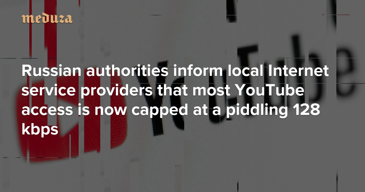 According to Meduza’s source in the telecoms industry, the Russian authorities are throttling YouTube “significantly” instead of blocking it outright and have informed operators that access on most home Internet connections is now capped at 128 kbps.