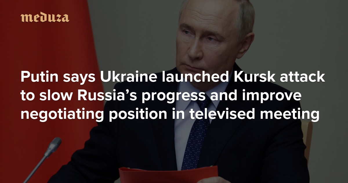 As Ukraine’s surprise cross-border offensive into Russia’s Kursk region carried into its seventh day on Monday, Vladimir Putin convened a televised meeting with top security officials to discuss the unprecedented situation. Claiming that Ukraine launched the foray to improve its negotiating position and to slow Russia’s advance on Ukrainian territory, the Russian president argued that the incursion has in fact made peace talks less likely and that Moscow’s battlefield progress has only accelerated. At the same time, acting Kursk Governor Alexey Smirnov called the situation in his region “difficult” and said Ukraine currently controls 28 settlements. Meduza shares key takeaways from the event.