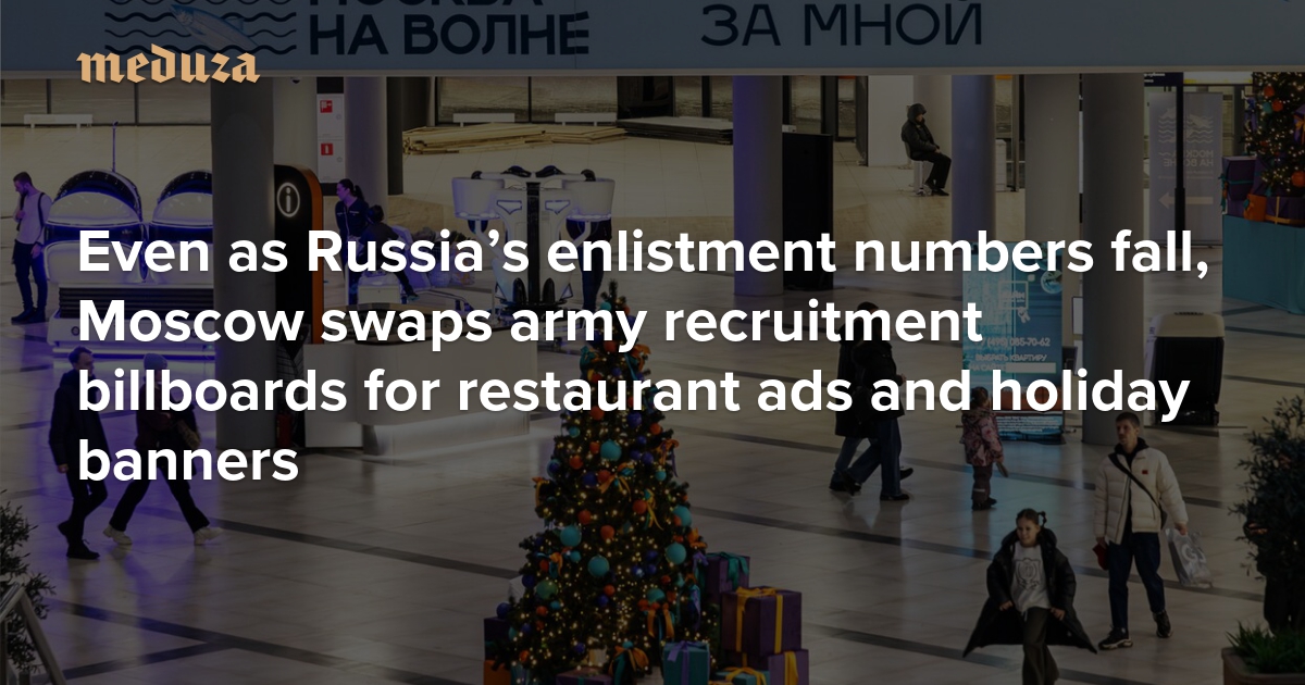 Two sources close to Putin’s administration told Meduza that military recruitment ads are being replaced with “typical Moscow-style advertising.” By late 2024, ads for contract service on central streets were swapped out for enticements to explore Moscow’s “freshest catch” (mainly restaurants) and New Year banners.