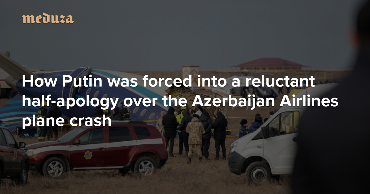 On December 25, an Embraer 190 passenger plane operated by Azerbaijan Airlines crashed in western Kazakhstan while en route from Baku to Grozny. More than half of the 67 people onboard were killed. Several potential causes were reported in the initial hours after the crash, including a bird strike, bad weather, and an oxygen tank explosion. After investigators examined the wreckage, however, they concluded that a Russian anti-aircraft missile likely damaged the plane. Azerbaijan soon demanded that Russia pay compensation for the crash and hold those responsible criminally liable. Then, on Saturday, Vladimir Putin issued a rare apology over the “tragic incident,” though he stopped short of admitting Russia’s responsibility outright. Meduza tracks the diplomatic fallout from the crash and the ongoing investigations into its cause.
