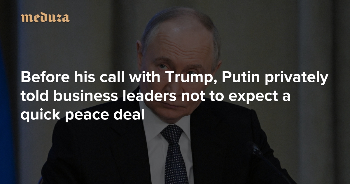 Before his call with Donald Trump on Tuesday, Vladimir Putin “made it clear” to Russian business leaders that they should not expect a swift peace agreement in the war with Ukraine, the Telegram channel Faridaily reports, citing two sources who attended the meeting and another who heard about it from participants.