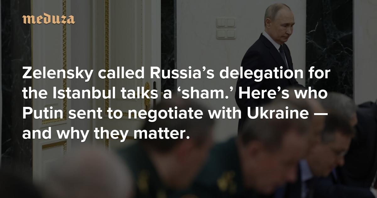 Last Sunday, Vladimir Putin proposed resuming direct negotiations with Kyiv in Istanbul on Thursday, May 15. Ukrainian President Volodymyr Zelensky responded that he was ready to meet Putin there in person. Then, for several days, Russian officials demurred over whether the president would attend. On the eve of the planned talks, Putin released a list of officials appointed to Russia’s delegation — and he wasn’t on it. The group, which Zelensky subsequently called a “sham delegation,” includes Vladimir Medinsky, who led the Russian negotiating team during the last direct talks with Ukraine in 2022, and the head of the GRU, Russia’s military intelligence agency. With the talks now reportedly set to begin on Friday, Meduza explains who Putin appointed to the Kremlin’s delegation what their presence might reveal about Moscow’s goals.