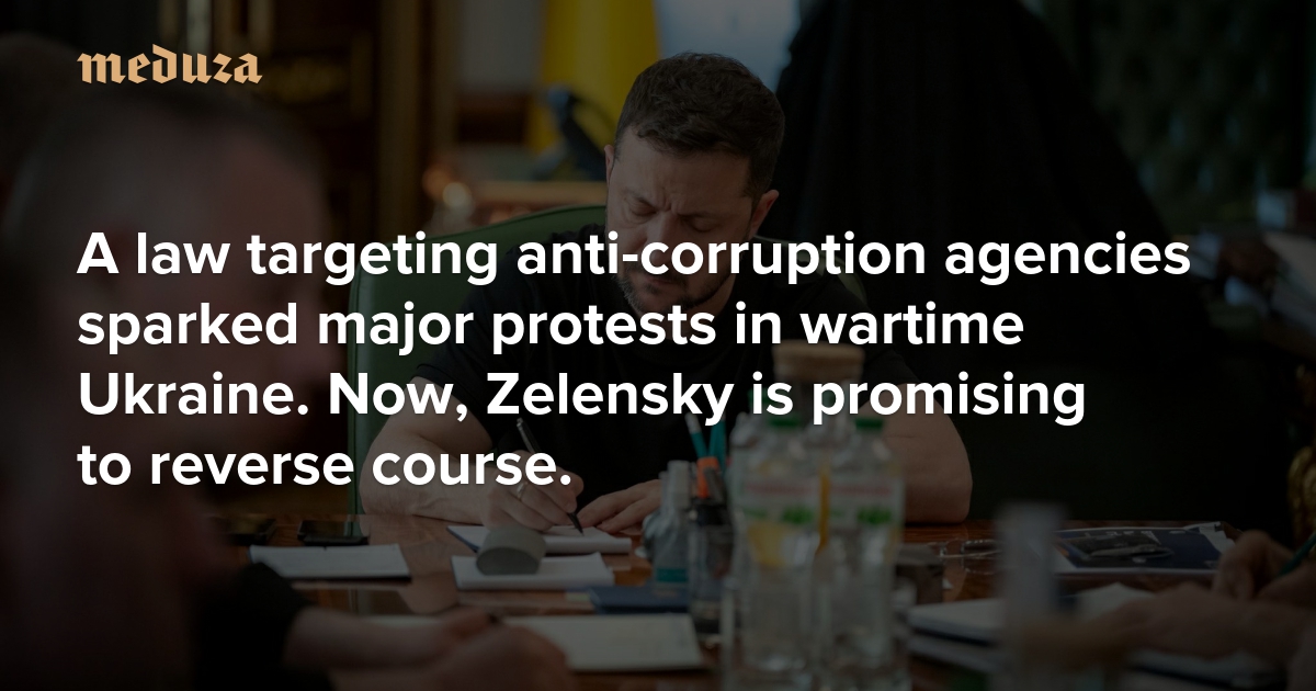 After signing a bill that effectively strips Ukraine’s anti-corruption bodies of their independence, President Volodymyr Zelensky has now promised to propose a new law to strengthen them again. The controversial legislation, which was pushed through the Verkhovna Rada on July 22, subordinates the National Anti-Corruption Bureau (NABU) and the Specialized Anti-Corruption Prosecutor’s Office (SAPO) to the Prosecutor General’s Office — disregarding the fact that their independence has been a key condition of Ukraine’s E.U. integration. Ukrainians in cities across the country took to the streets in defense of these institutions on July 22, resulting in the largest protests the country has seen since Russia’s 2022 invasion. Meduza explains what you need to know about the bill, the backlash, and what Zelensky plans to do next.
