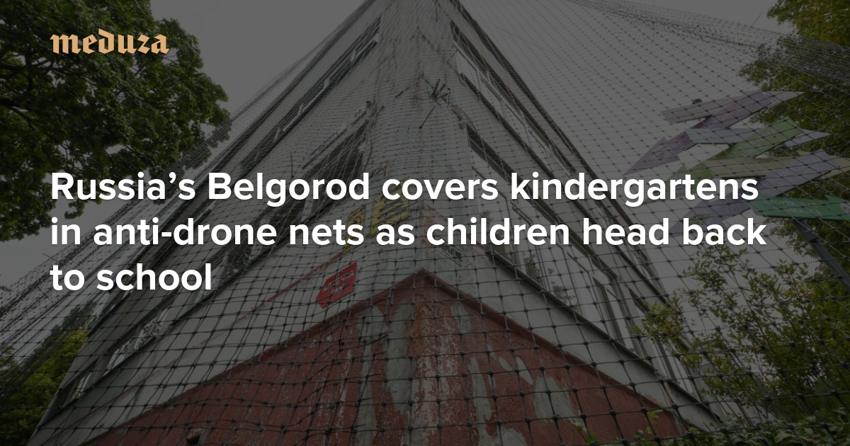In Russia’s Belgorod region, which shares a border with Ukraine, many buildings have been covered in nets to protect them from Ukrainian drones. While anti-drone netting was first installed on buildings (and ambulances) in areas along the border, Governor Vyacheslav Gladkov announced in late August that the regional capital and the surrounding district would install nets over local kindergartens too. According to the governor, local authorities purchased 500,000 square meters of protective netting — an area equivalent to roughly 70 soccer fields — and planned to cover 56 buildings ahead of the new school year, which begins on September 1. However, he also noted that in border areas, some protective nets covering residential buildings and public infrastructure are already in need of repairs or replacement. Meduza shares photos of the anti-drone nets installed over Belgorod’s kindergartens, which were first distributed by the Russian state news agency RIA Novosti.