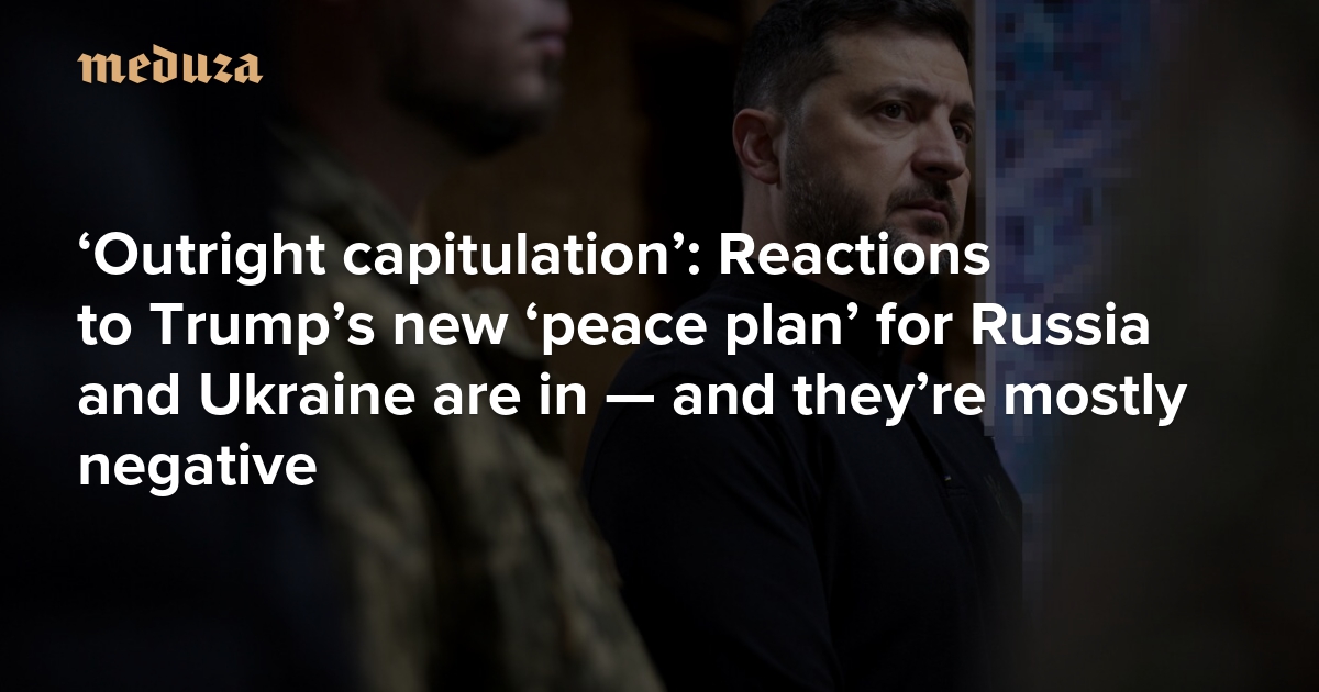 On November 19, several Western media outlets published details of a new “peace plan” quietly drafted by U.S. and Russian officials. The 28-point document, which was drawn up without input from Ukraine or the European Union, largely echoes the Kremlin’s maximalist demands. And it appears that almost no one in Ukraine, the West, or even in Russia considers it realistic. To give a sense of just how widespread the criticism is, Meduza shares a selection of reactions.