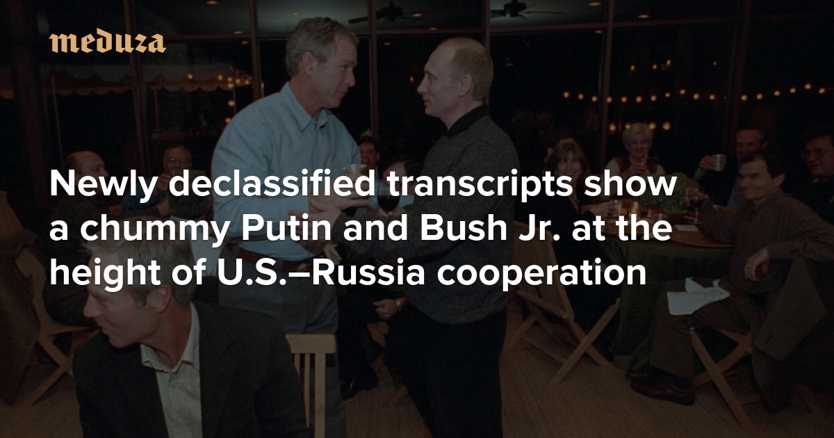 The National Security Archive at George Washington University has published eight newly declassified transcripts of conversations between Vladimir Putin and George W. Bush. These exchanges took place between 2001 and 2003 — a period when both presidents were actively searching for ways to cooperate. Despite persistent tensions in U.S.–Russian relations, including NATO expansion, Washington’s push to withdraw from the Anti-Ballistic Missile (ABM) Treaty, and the Jackson–Vanik Amendment, Putin and Bush managed to build close cooperation on counterterrorism and nuclear nonproliferation. Even when the discussions touched on sensitive issues, the tone of the conversations remained consistently warm. The transcripts make clear that during their first presidential terms, Bush and Putin succeeded in forging a genuinely close personal relationship. Meduza traces the evolution of the Putin-Bush “friendship.”