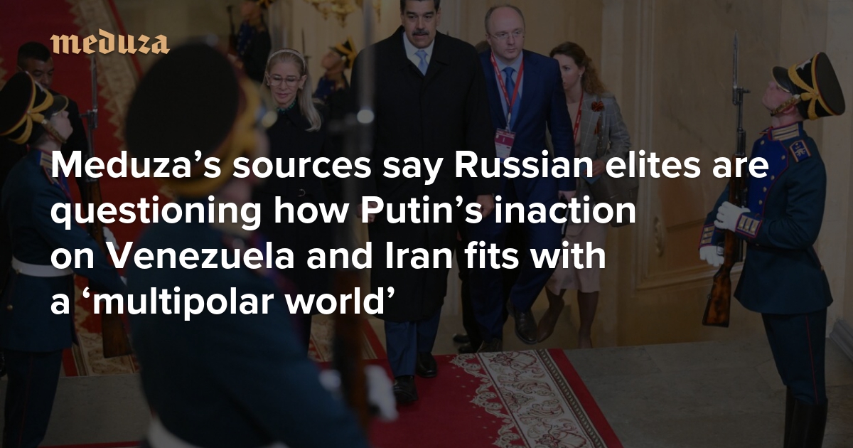 Russian elites are unsettled by the U.S. capture and arrest of Venezuelan President Nicolás Maduro, Washington’s efforts to assert control over the South American country, and the ongoing protests in Iran, according to two people close to the Putin administration and one source close to the Russian government who spoke with Meduza.