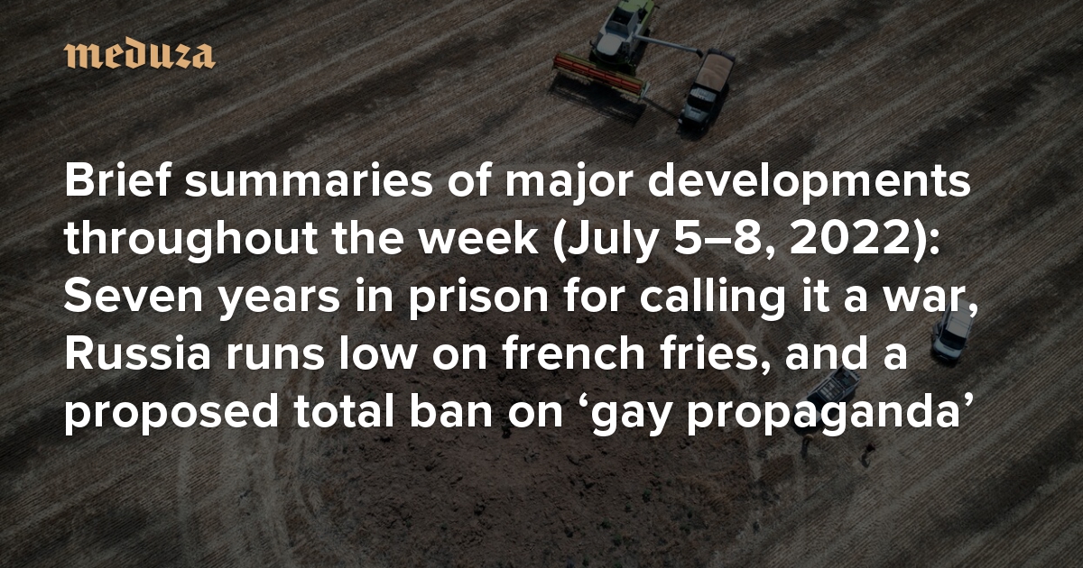 News Feed Brief summaries of major developments throughout the week (July 5–8, 2022): Seven years in prison for calling it a war, Russia runs low on french fries, and a proposed total ban on ‘gay propaganda’
