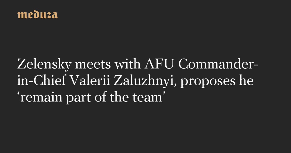 Ukrainian President Volodymyr Zelensky met with the Commander-in-Chief of Ukraine’s Armed Forces (AFU) Valerii Zaluzhnyi and proposed that he “remain part of the team,” according to a statement on Zelensky’s Telegram channel.