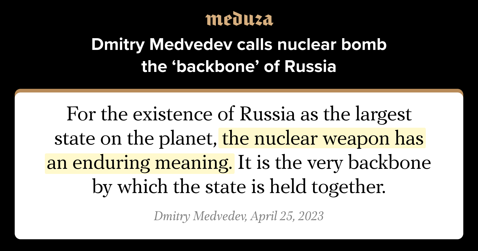 Medvedev calls nuclear bomb the ‘backbone’ of state Speaking at the educational marathon ‘Knowledge. Firsts,’ the former president says that Russia could be the first to use nuclear weapons