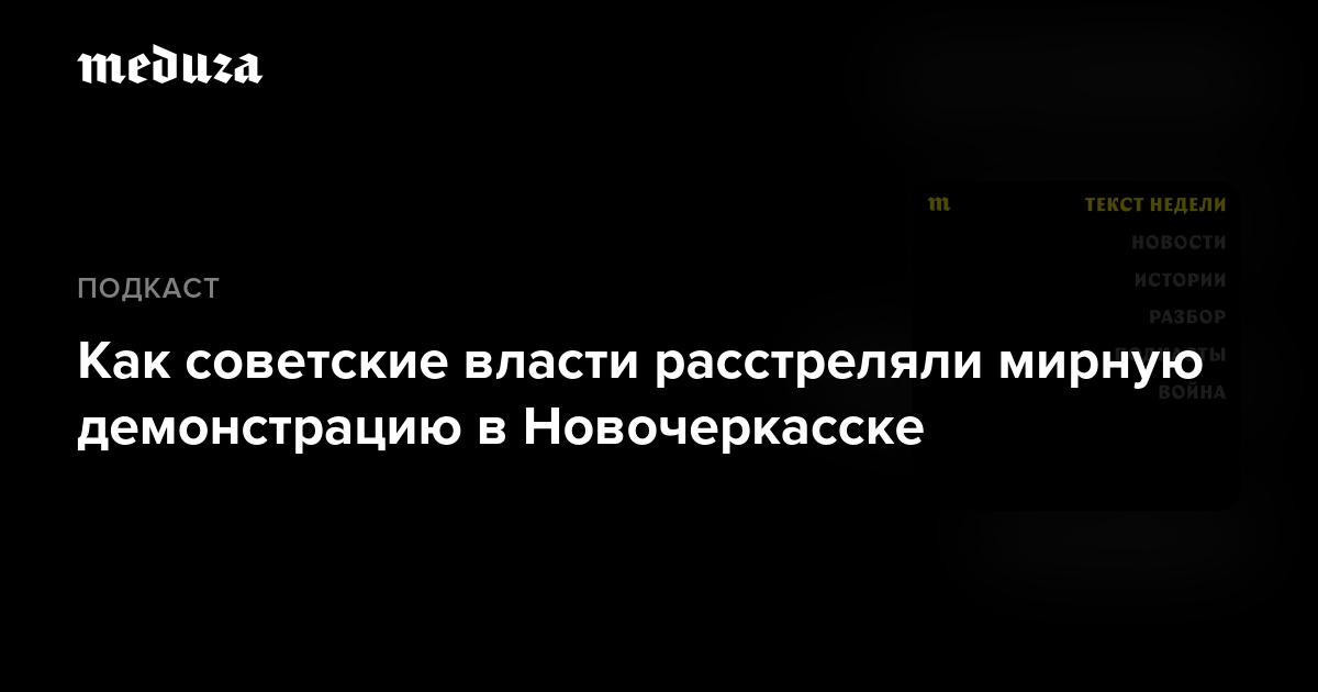 В 1962 году в Новочеркасске — фабричном городе неподалеку от Ростова-на-Дону — военные расстреляли демонстрацию рабочих, требовавших улучшения условий жизни и понижения цен. Погибли более 25 человек; более 85 были ранены. Власти СССР десятилетиями скрывали информацию о произошедшем; семерых участников демонстрации расстреляли, более ста — приговорили к десяти годам тюрьмы. Спецкор «Медузы» Даниил Туровский отправился в Новочеркасск, встретился с людьми, которые 55 лет хранили память о случившемся, изучил материалы уголовного дела, книги, фильмы и документы — и по порядку рассказал полную историю Новочеркасского расстрела. Текст читает Павел Борисов.
