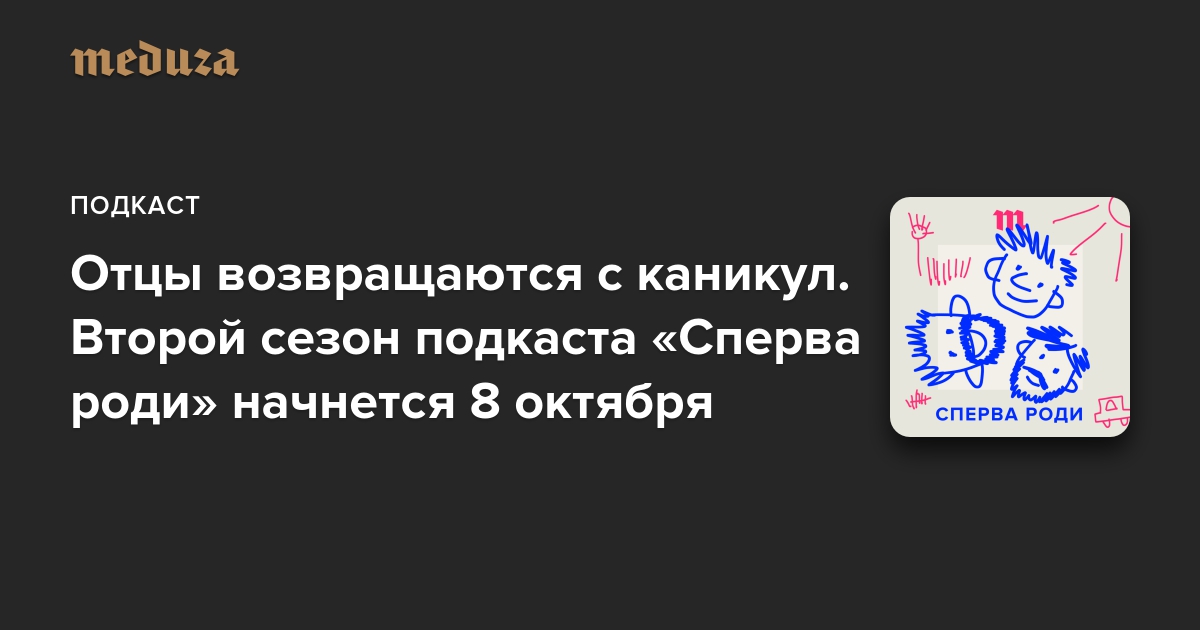 8 октября стартует второй сезон «Сперва роди» — подкаста о детях и о том, как их воспитывать. Каждый вторник три отца — Александр Борзенко, Владимир Цыбульский и Юрий Сапрыкин — не дают советов, зато делятся своими тревогами, сомнениями, переживаниями и смешными историями. А еще отвечают своим слушателям — кстати, пишите нам в телеграм @meduzalovesyou или на почту [email protected], мы читаем все ваши письма.