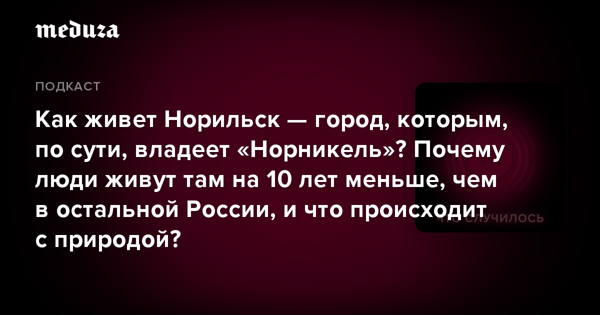Каков масштаб экологической катастрофы в Норильске? Как городские власти реагируют на публикации журналистов? Как живут люди в городе за полярным кругом, предприятия которого зарабатывают миллиарды долларов, а вся жизнь людей подчинена корпорации? Об этом в новом эпизоде подкаста «Что случилось» — спецкор «Новой газеты» Елена Костюченко из Норильска и руководитель городского общественного объединения «Мой дом» Руслан Абдуллаев.