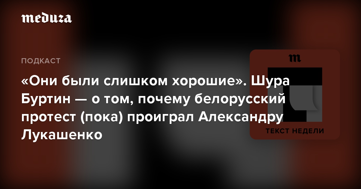 Весной 2021 года журналист Шура Буртин увидел в фейсбуке тревожный пост знакомой белорусской актрисы «Все очень плохо». Это подтолкнуло его поехать в Минск и поговорить с людьми, которые непосредственно участвовали или были свидетелями оппозиционных протестов 2020 года. Их монологи легли в основу масштабной хроники «Мы так много сделали и не смогли победить», опубликованной на «Медузе». В подкасте «Текст недели» Шура Буртин рассказал, что думает о причинах белорусского протеста и почему Александр Лукашенко смог сохранить пост президента.