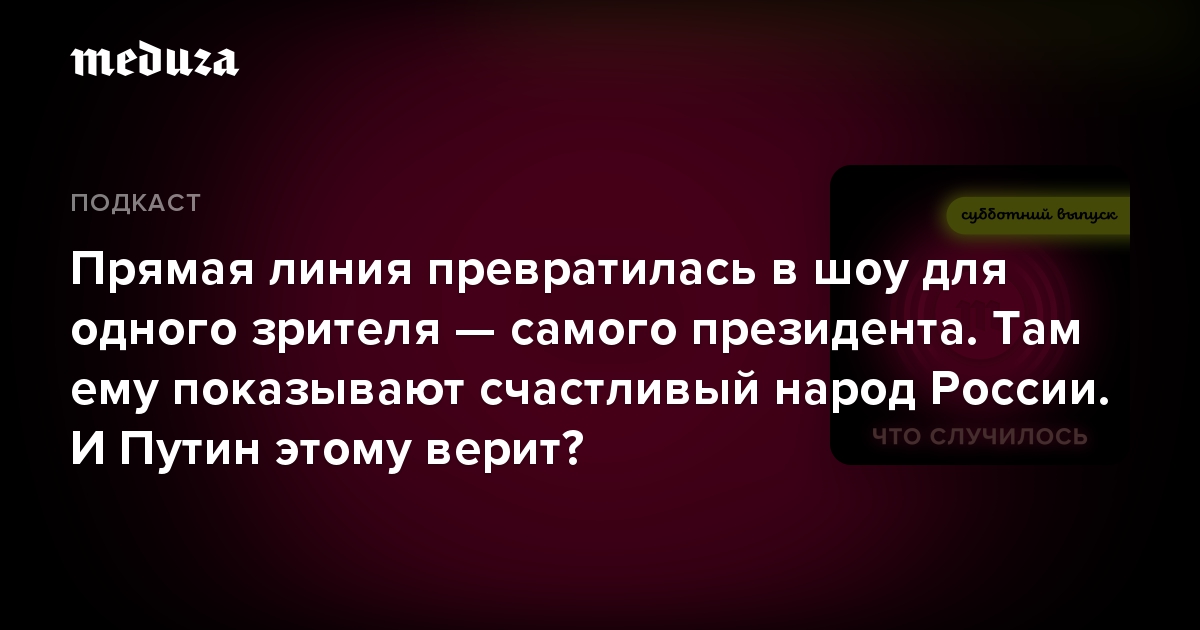 Ведущие субботнего выпуска «Что случилось» Константин Гаазе и Андрей Перцев уверены, что, как и вся российская внутренняя политика, прямая линия — шоу для одного человека. И этот один человек, президент страны, остался доволен: теперь никто не скажет, что вопросы были подставными, как в 2017 году, когда общение с гражданами выглядело политическим фиаско.