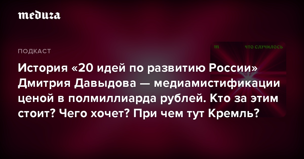 В новом выпуске «Что случилось» обсуждаем эти вопросы с автором одного из расследований о «20 идеях», специальным корреспондентом Русской службы BBC News Андреем Захаровым (признан российскими властями «иностранным агентом», мы обязаны указывать это по закону). Если вам не хватит нашего подкаста, можете послушать выпуск «Что это было?», его делают наши коллеги «Русской службы Би-би-си».