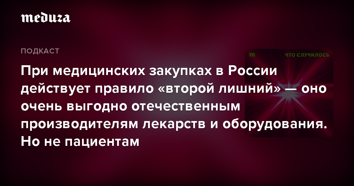 К тому же правило «второй лишний» уже работает при закупке медицинских изделий и оборудования. Как оно влияет на пациентов и производителей? И почему все это — не самая лучшая идея? В этом выпуске «Что случилось» объясняют обозреватели издания об индустрии здравоохранения Vademecum Полина Гриценко и Михаил Мыльников.