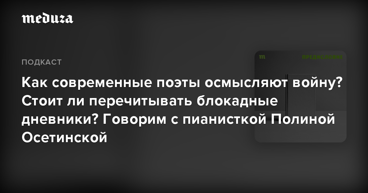 Литературный обозреватель «Медузы» Галина Юзефович говорит о чтении в военное время с пианисткой Полиной Осетинской. Как современные поэты стали летописцами войны и какие стихи помогают осмыслить происходящее? Можно ли сегодня опираться на блокадные дневники и воспоминания о Великой Отечественной? Почему все сложнее погружаться в большую прозу и нужно ли заставлять себя дочитывать книги?