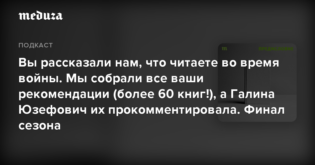 Мы запустили подкаст «Предисловие», чтобы понять, как изменились читательские привычки с началом войны в Украине. Литературный обозреватель «Медузы» Галина Юзефович говорила с гостями о том, какие книги спасают их и можно ли найти в литературе объяснение происходящему. О чтении военного времени рассказывали экономист Константин Сонин, актер Артур Смольянинов, биолог Илья Колмановский, писатели Леонид Юзефович, Яна Вагнер, Наринэ Абгарян и Марина Степнова, пианистка Полина Осетинская, политик Юлия Галямина, журналист Юрий Сапрыкин.