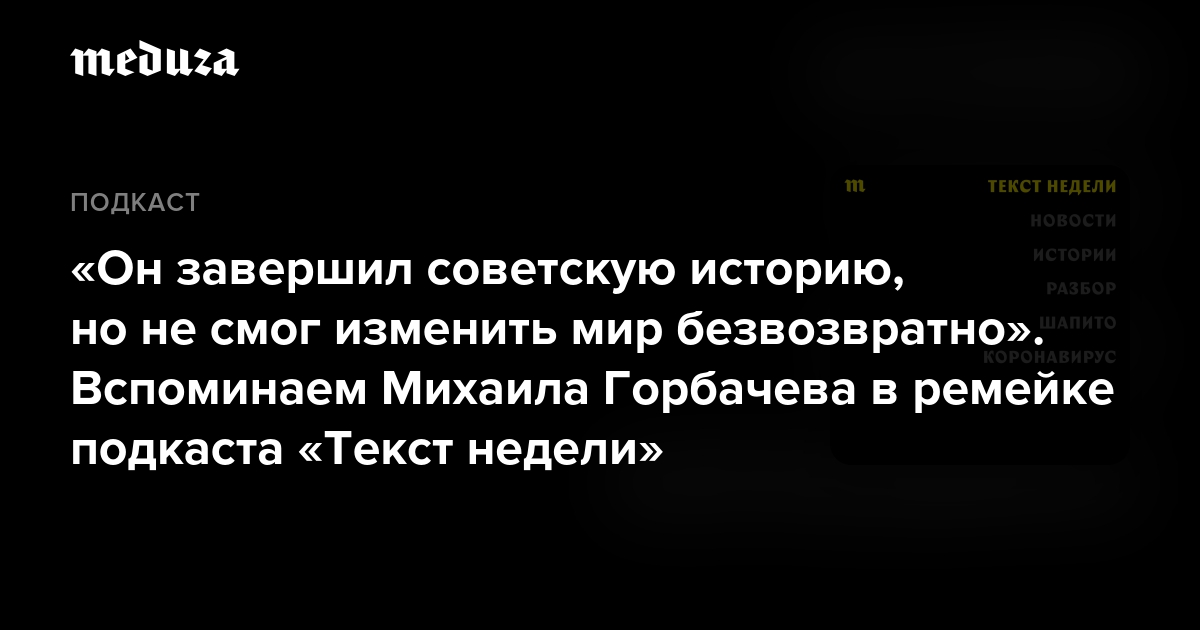 В 2018 году журналист Илья Жегулев написал для «Медузы» большой материал о Горбачеве и взял у него интервью. Тогда же выходил выпуск «Текста недели», посвященный этим статьям.
