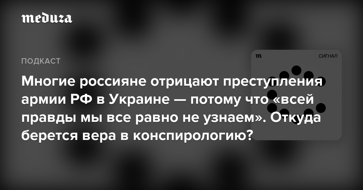 Нет ничего особенного в том, что в кризисной ситуации конспирологов становится больше. Продолжающаяся война это наглядно демонстрирует: россияне с подачи высшего руководства верят и в проект «анти-Россия», и в «биолаборатории», и в «золотой миллиард». Но чем особенна конспирология в РФ? Рассказываем в новом эпизоде подкаста «Сигнал».