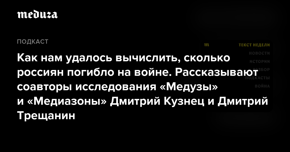 Журналисты «Медузы» и «Медиазоны» несколько месяцев проводили совместное исследование, чтобы статистическими методами оценить реальное число погибших на войне россиян. Для этого использовались два источника (и два разных метода): реестр наследственных дел и официальные данные о смертности от Росстата.