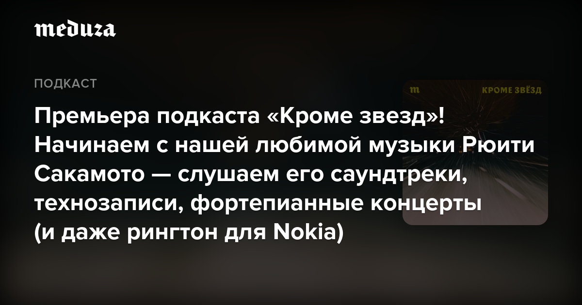 В подкасте «Кроме звезд» журналист Александр Филимонов и музыкант Евгений Федоров говорят о песнях и альбомах, которые спасают даже в самые темные времена. Начинается этот разговор с японского композитора Рюити Сакамото — всю свою музыкальную карьеру он экспериментировал со звуком, и результаты этих экспериментов можно услышать не только на десятках альбомов, но и в художественных фильмах.