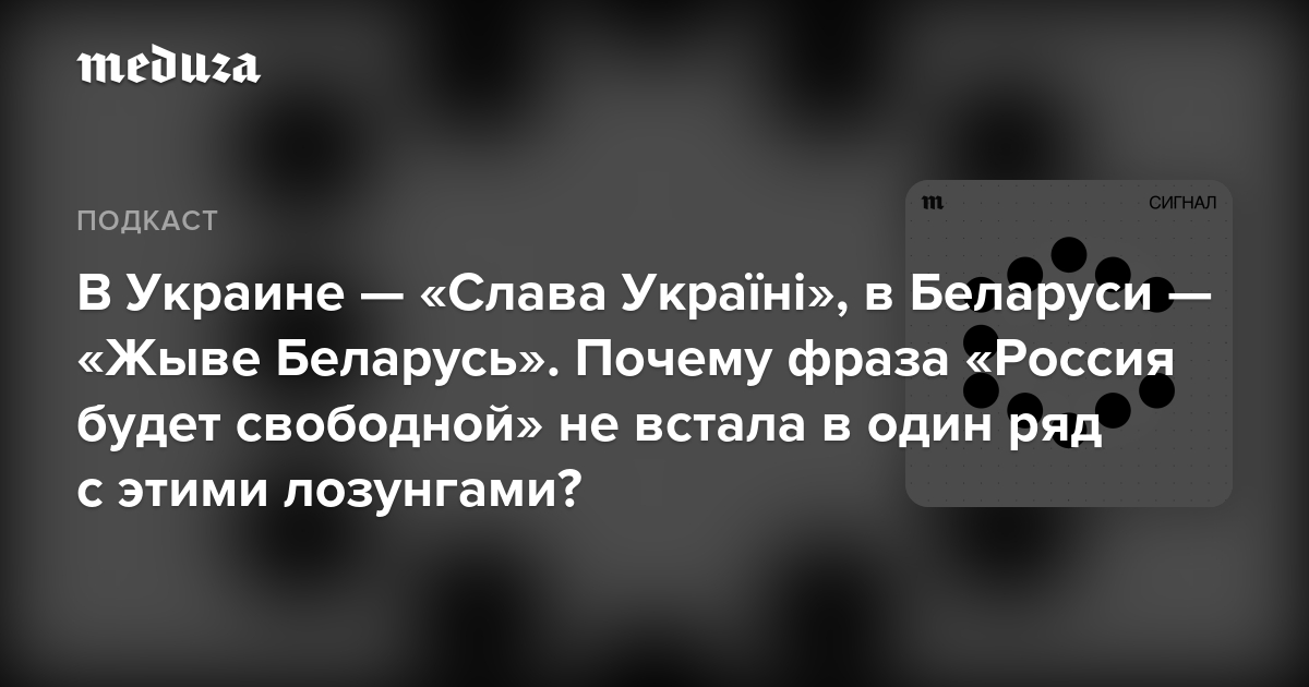 Однако формула «Россия будет свободной», несмотря на свою политическую актуальность, все же пока не стала настолько массовой, как «Слава Україні» (об этом лозунге у подкаста есть отдельный эпизод) и «Жыве Беларусь».