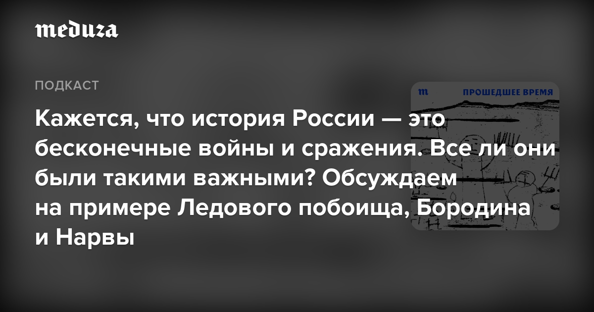 Ведущие «Прошедшего времени» Дмитрий Карцев и Сергей Фокин обсуждают, почему государство так любит говорить о войнах прошлого и возможна ли история, не зацикленная на боях и сражениях. А еще спорят о том, помогают ли битвы развитию и прогрессу.