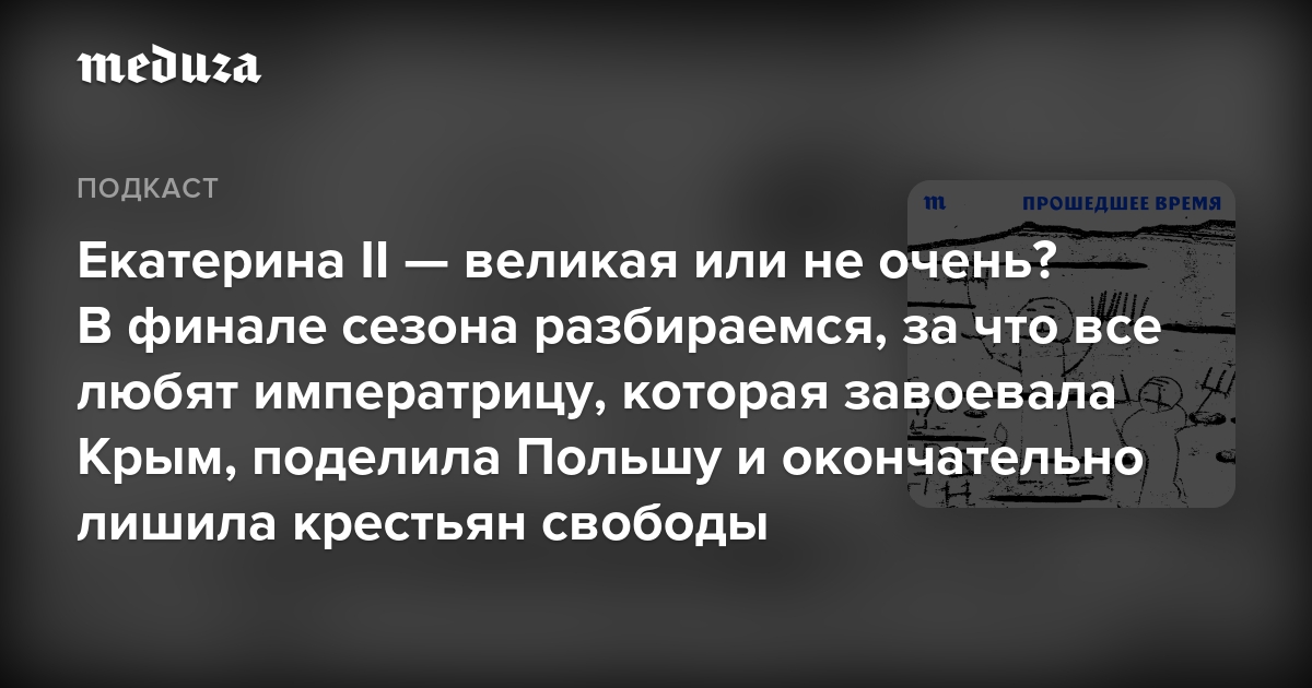 В финале сезона ведущие «Прошедшего времени» Дмитрий Карцев и Сергей Фокин пытаются понять, за что все так любят Екатерину — и что это говорит о российском обществе.