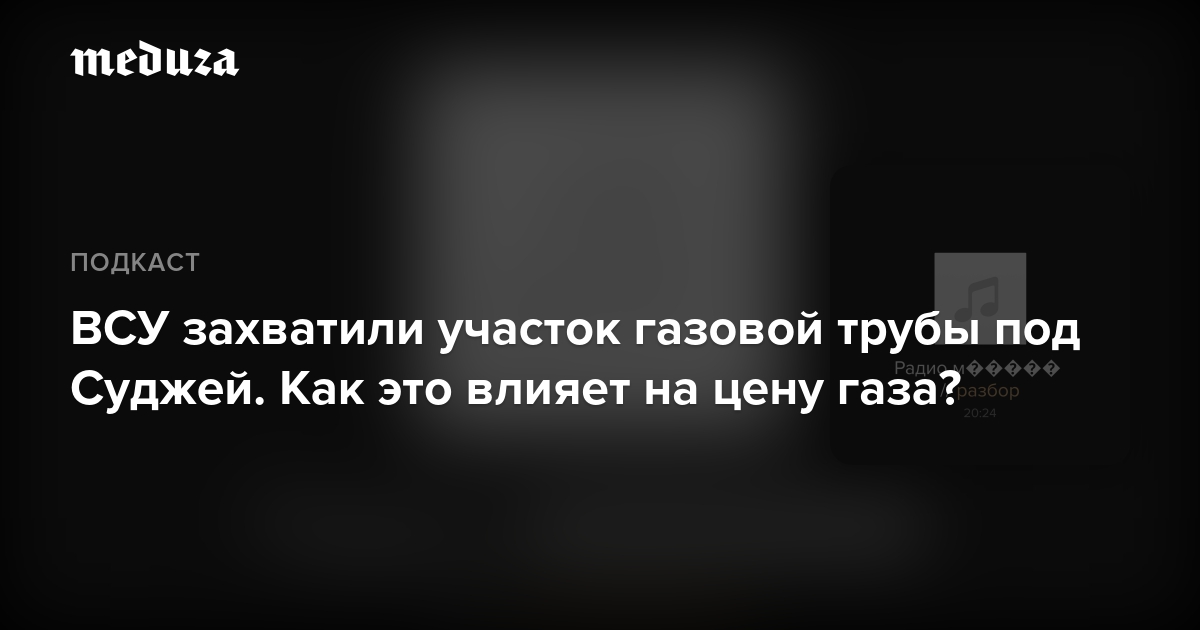 «Радио Медуза» рассказывает о самой станции «Суджа» и ее захвате и о том, что происходит с газопроводом. А также — насколько уже выросли (и еще могут вырасти) цены на газ и почему работающая труба нужна обеим воюющим сторонам. Прочитать материал об этом можно здесь.