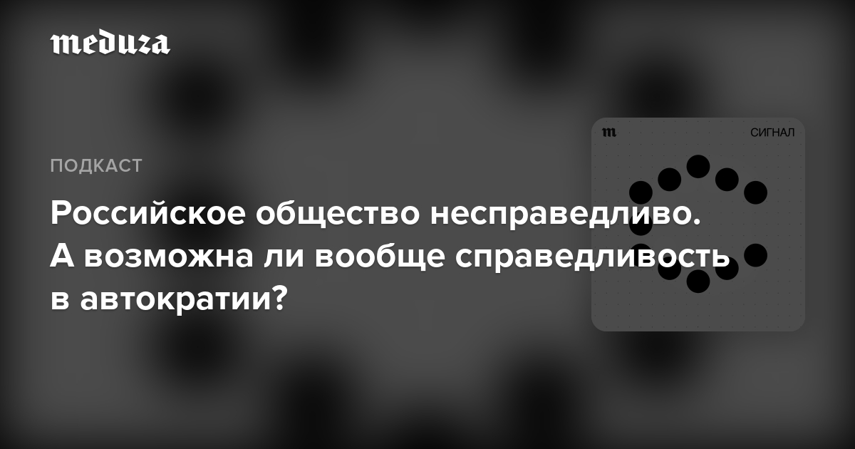 Вопрос о справедливости устройства российского общества — ключевой в многолетнем споре о правильном «пути страны». Возможна ли справедливость в автократии? И почему даже демократия не всегда может ее гарантировать? В этом «Сигнале» разбираемся, что россияне думают о справедливости.