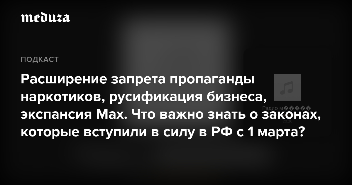 Расширенный запрет пропаганды наркотиков, русификация бизнеса, экспансия мессенджера Max, микрозаймы по биометрии — послушайте обзор этих и других инициатив на «Радио Медуза». Прочитать разбор можно здесь.