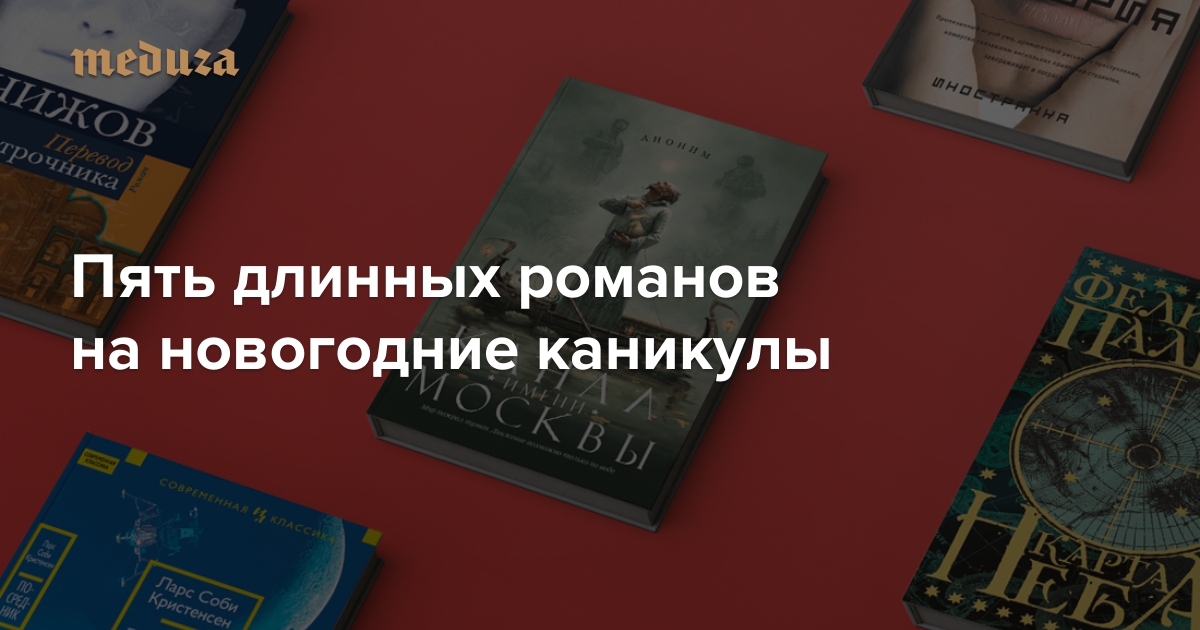 Специально к новогодним праздникам литературный критик Галина Юзефович выбрала пять длинных и увлекательных романов. В список вошли как новинки, так и книги, переизданные в 2014 году: «Перевод с подстрочника» Евгения Чижова, «Канал имени Москвы» Анонима, «Тайная история» Донны Тартт, «Карта неба» Феликса Х. Пальмы, «Посредник» Ларса Соби Кристенсена.