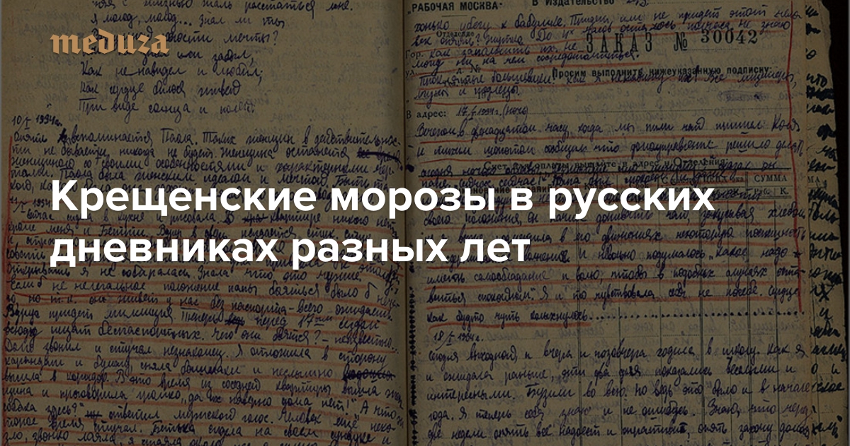 «Медуза» начинает вместе с проектом «Prozhito» публиковать отрывки из дневников разных лет. Сегодня, в день Крещения, мы выбрали записи о том, что происходило в жизни людей во время крещенских морозов. Редакция «Медузы» отбирала дневники XIX века, «Prozhito» — XX-го.«Prozhito» — сетевой проект историка Михаила Мельниченко, который планирует с помощью краудсорсинга собрать, оцифровать и опубликовать все личные дневники, написанные в советский период истории России.