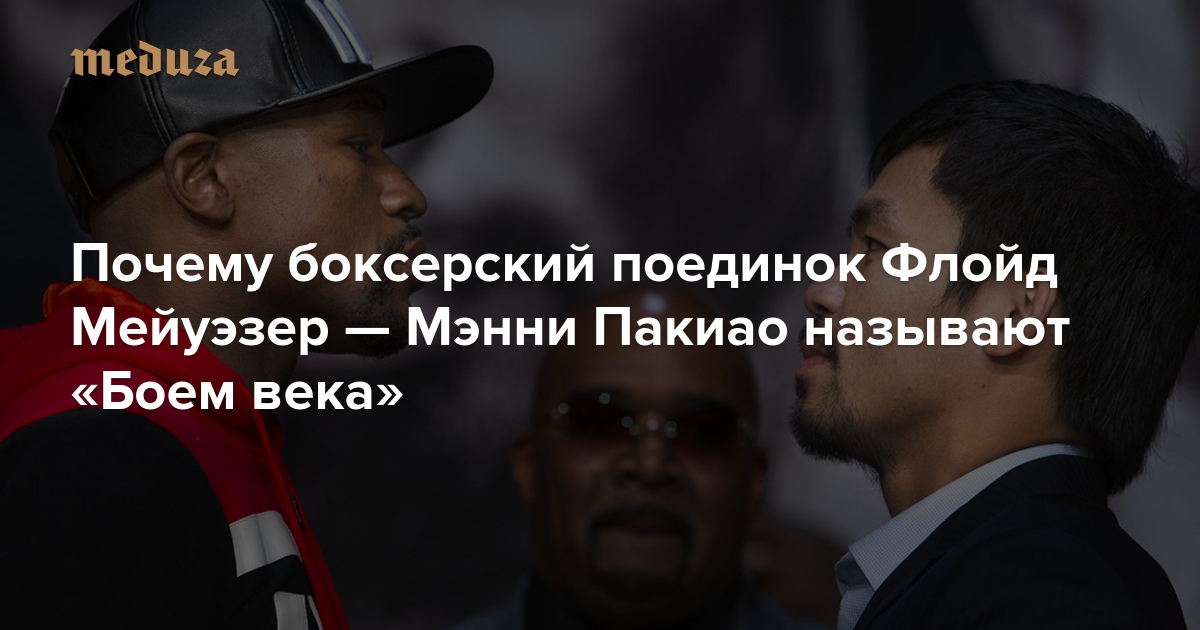 В ночь на 3 мая состоится один из главных боксерских поединков современности — на ринг в Лас-Вегасе выйдут американец Флойд Мейуэзер и филиппинец Мэнни Пакиао. «Медуза» попросила журналиста Андрея Мельникова рассказать для тех, кто не слишком разбирается в боксе, кто такие Мейуэзер и Пакиао, как шла подготовка к бою и почему его обязательно стоит посмотреть, даже несмотря на то, что он пройдет сильно за полночь.