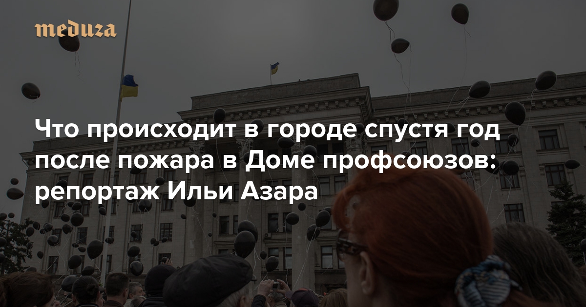 За прошедший год в Одессе никого не осудили, а самое детальное расследование событий 2 мая подготовила независимая комиссия. Согласно ее выводам, все люди в Доме профсоюзов погибли из-за отравления, прямого огня или в результате падения из окон. До сих пор непонятно, почему так безвольно вела себя милиция и почему с огромным опозданием приехали в Дом профсоюзов пожарные. Специальный корреспондент «Медузы» Илья Азар съездил в Одессу и выяснил, что сторонники «Антимайдана» продолжают обсуждать слухи о применении смертельного газа и о 500 погибших, а также ждут помощи от Владимира Путина.
