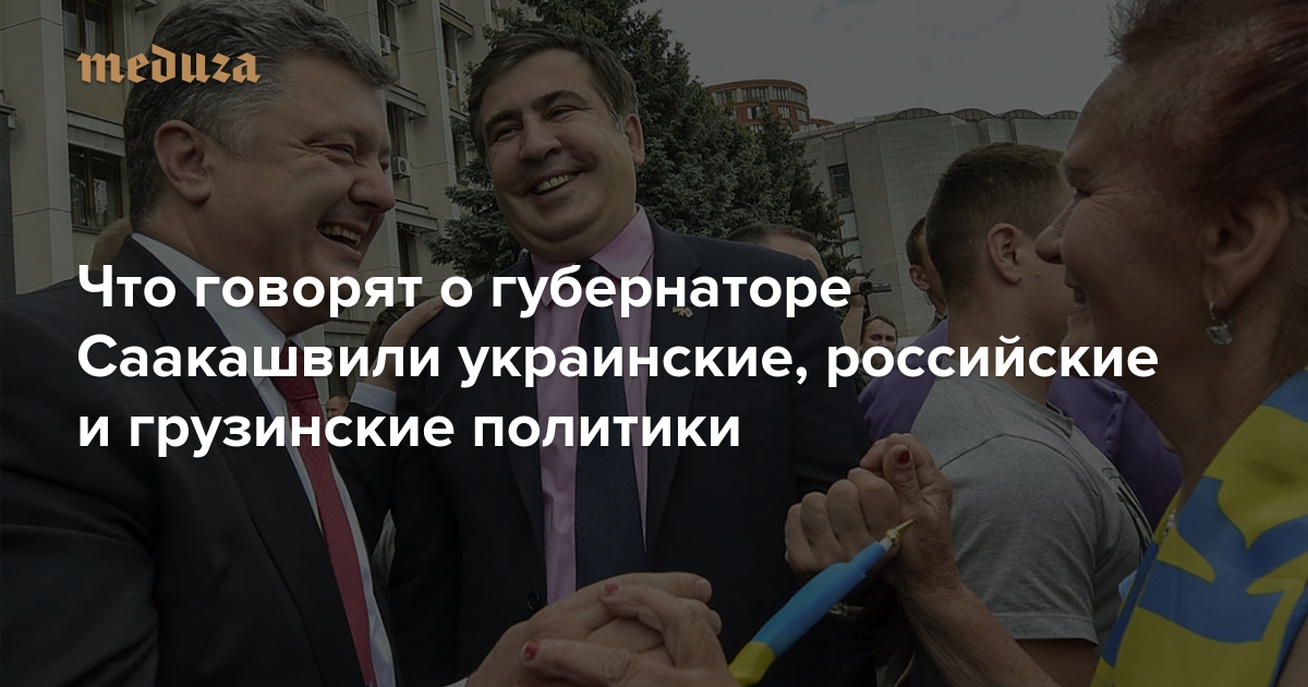 В субботу, 30 мая, президент Украины Петр Порошенко официально представил нового губернатора Одесской области — бывшего президента Грузии Михаила Саакашвили. Одновременно Порошенко подписал указ о присвоении Саакашвили гражданства Украины. Новый глава региона выступил с короткой речью по-украински, а затем перешел на русский: «То, что сейчас решается в Украине, во многом сейчас решается в Одессе. Это — южная столица Украины и столица Черного моря». Бывший президент уже приступил к работе: потребовал модернизировать сайт областной администрации и объявил о сокращении «должностей, не имеющих никакого смысла». Назначение Саакашвили вызвало целую волну комментариев российских, украинских и грузинских политиков — и резко негативных, и восторженных. «Медуза» выбрала самые интересные заявления.