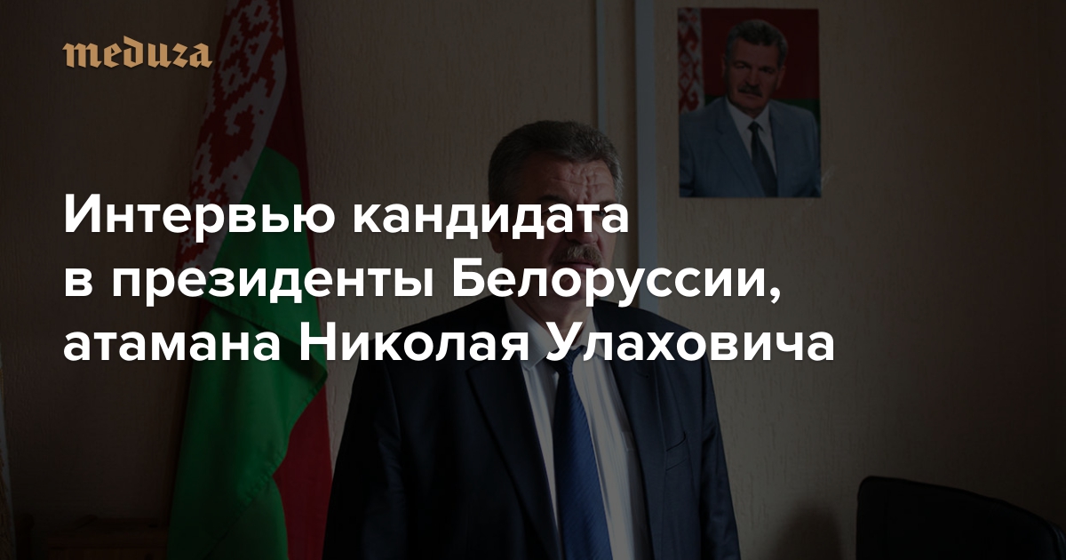 На выборах президента Белоруссии 11 октября у Александра Лукашенко три соперника. Помимо оппозиционера Татьяны Короткевич (интервью с ней читайте тут) это лидер Либерально-демократической партии Белоруссии Сергей Гайдукевич и верховный атаман организации «Белорусское казачество» Николай Улахович. Гайдукевич идет на выборы президента уже в третий раз, а вот об атамане Улаховиче, возглавляющем Белорусскую патриотическую партию, многие узнали впервые. Казачий кандидат не скрывает, что во многом поддерживает действующего президента Лукашенко, раньше был в «третьем эшелоне его команды» и выступает за окончательный разворот страны к России. Улахович рассказал специальному корреспонденту «Медузы» Илье Азару о недостатках Лукашенко, а также об отношении белорусских казаков к современному искусству.