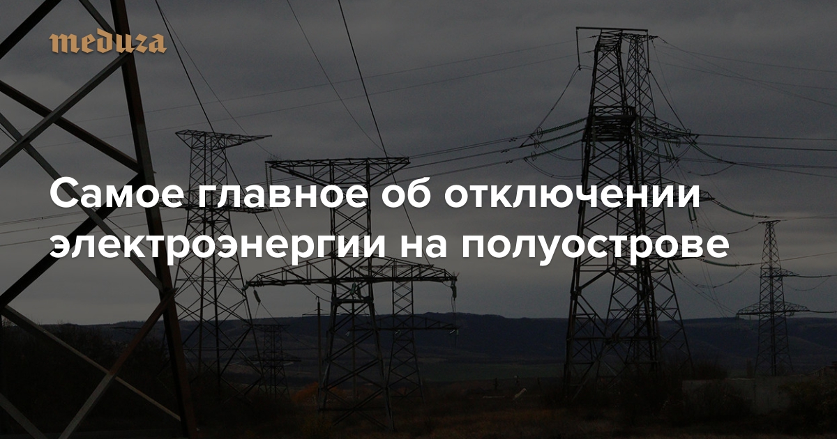 В ночь на 22 ноября Крым остался без света из-за того, что неизвестные взорвали опоры линий электропередач в Херсонской области Украины. Электроснабжение восстановят, в лучшем случае, через несколько дней, так что пока Крым привыкает к новым условиям — веерным отключениям энергии и воды, отсутствию троллейбусов и неработающим государственным учреждениям. «Медуза» коротко рассказывает о том, что произошло и как Крым справляется с чрезвычайной ситуацией.