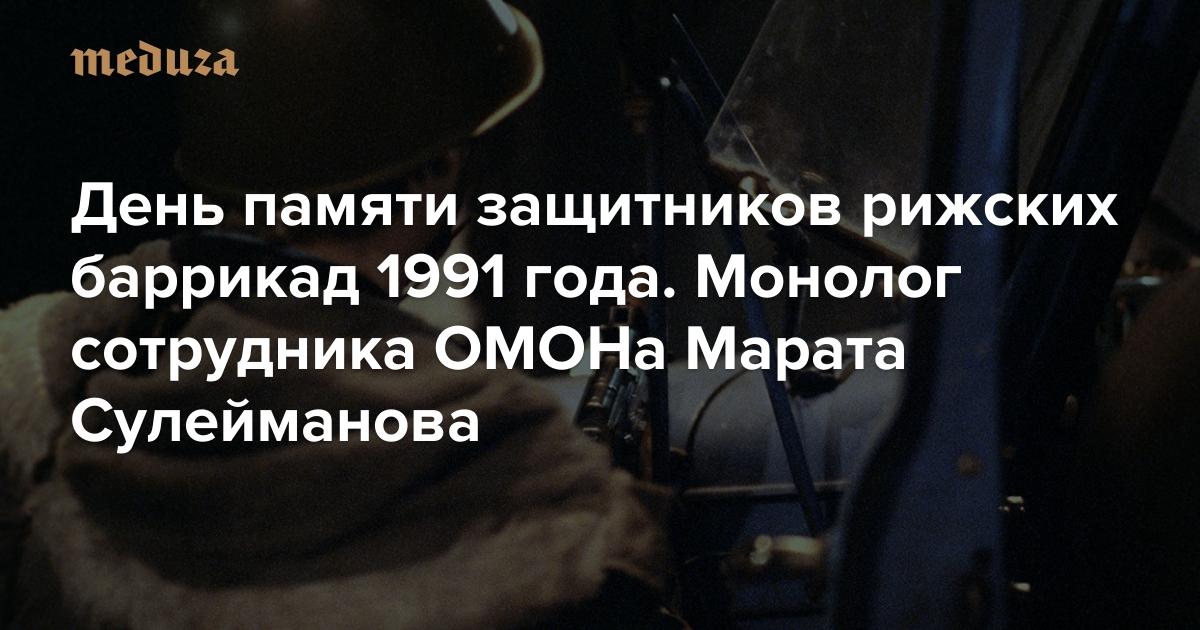 В Латвии вспоминают «Время баррикад» — период с 13 по 27 января 1991 года, когда советские власти пытались вернуть контроль в провозгласившей независимость республике. Среди главных действующих лиц были бойцы рижского ОМОНа, подчинявшегося Москве. Ночью 20 января началась стрельба в центре города, конфликтующие стороны боролись за здание МВД. Погибли пятеро — два кинооператора, два милиционера и 18-летний юноша. Виновных в их гибели так и не нашли. В 1999 году нескольких бывших бойцов рижского ОМОНа суд в Латвии приговорил к условным срокам за участие в «попытке вооруженного переворота» — так были квалифицированы январские события 1991 года. Специальный корреспондент «Медузы» Катерина Гордеева поговорила с бойцом рижского ОМОНа Маратом Сулеймановым, который в числе первых осужденных по этому делу получил три года условно.