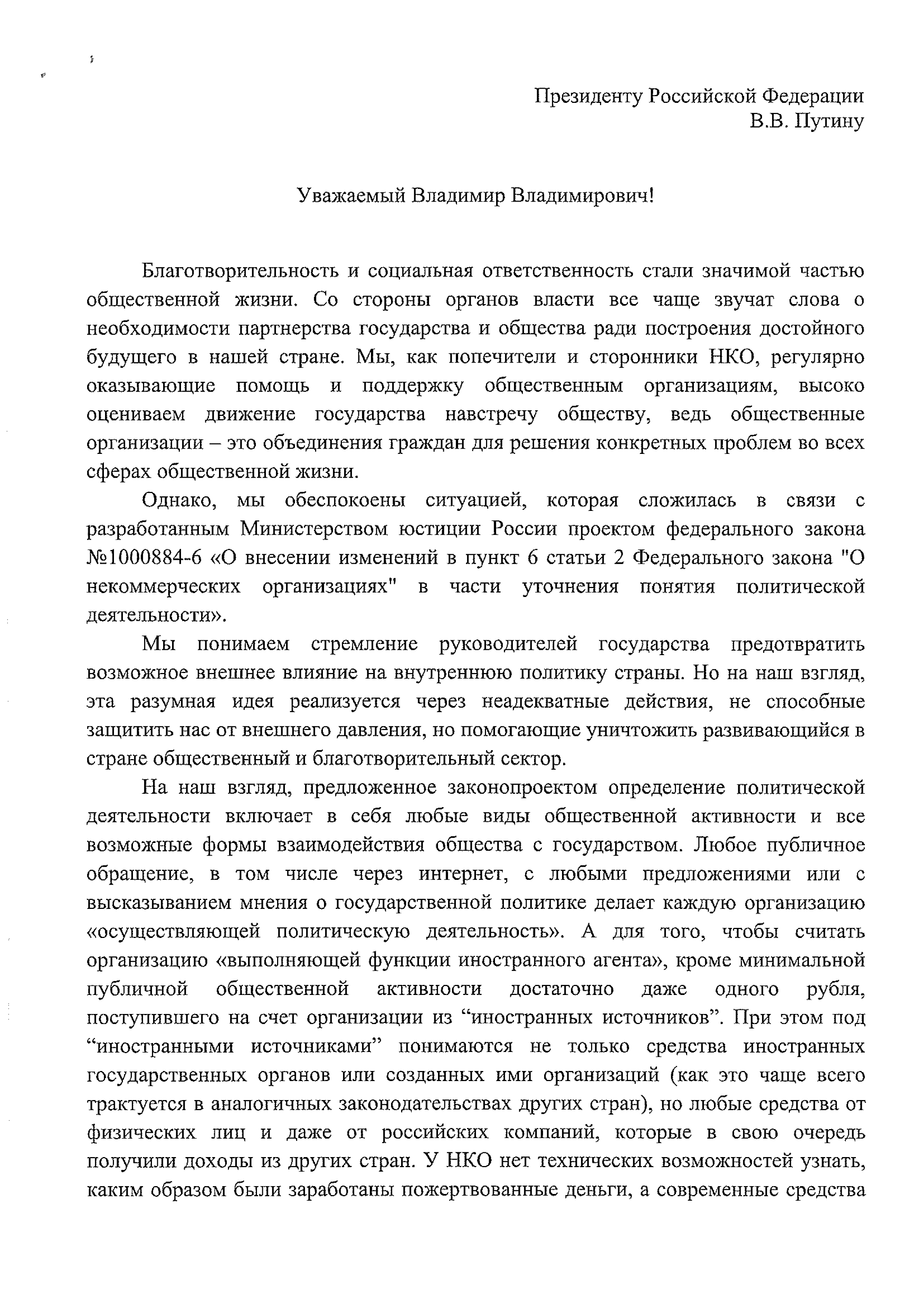 В письме на трех страницах благотворители не критиковали сам закон об «иностранных агентах» (к которому множество претензий у других, не благотворительных НКО; именно из-за него, например, закрылся фонд мецената Дмитрия Зимина «Династия»), но даже соглашались с Путиным: идея обезопасить внутреннюю политику страны от внешних посягательств — разумная. При этом благотворители просили не приравнивать к политической просветительскую и общественную деятельность фондов. Объясняли, что без разговоров с врачами и чиновниками, без доработки законов, без смягчения нравов и распространения идей милосердия многие — уже запущенные — процессы остановятся. А новые не начнутся.